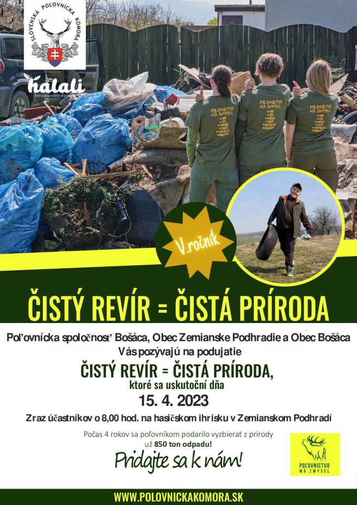 Poľovnícka spoločnosť Bošáca, Obec Zemianske Podhradie a Obec Bošáca Vás pozývajú na podujatie "Čistý revír = čistá príroda", ktoré sa uskutoční dňa 15.4.2023. Zraz účastníkov o 8,00 hod. na hasičskom ihrisku v Zemianskom Podhradí.
