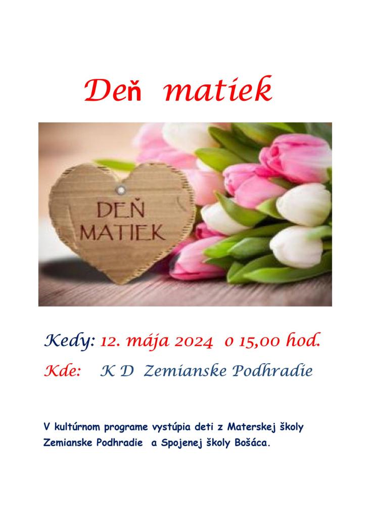 Samospráva obce Zemianske Podhradie Vás pozýva pri príležitosti sviatku "Dňa matiek" do kultúrneho domu v Zemianskom Podhradí 12. mája o 15,00 hod. V kultúrnom programe vystúpia deti z Materskej školy Zem. Podhradie a Spojenej školy Bošáca.