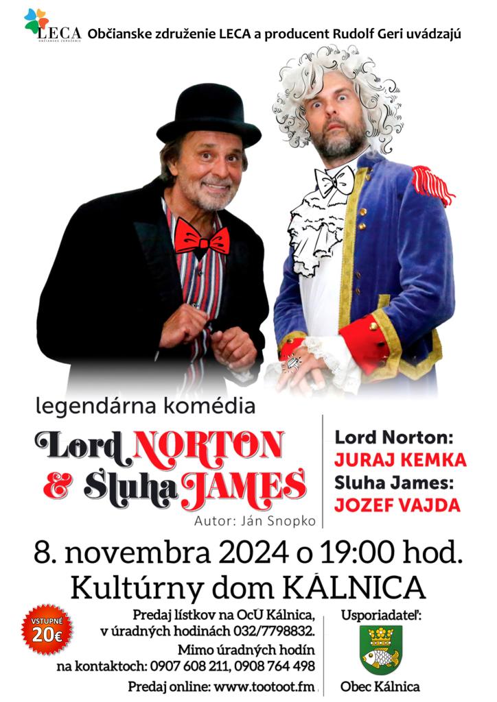 Občianske združenie LECA Vás pozýva 8.11.2024 o 19,00 hod. do KD Kálnica na legendárnu komédiu Lord Norton & Sluha James.