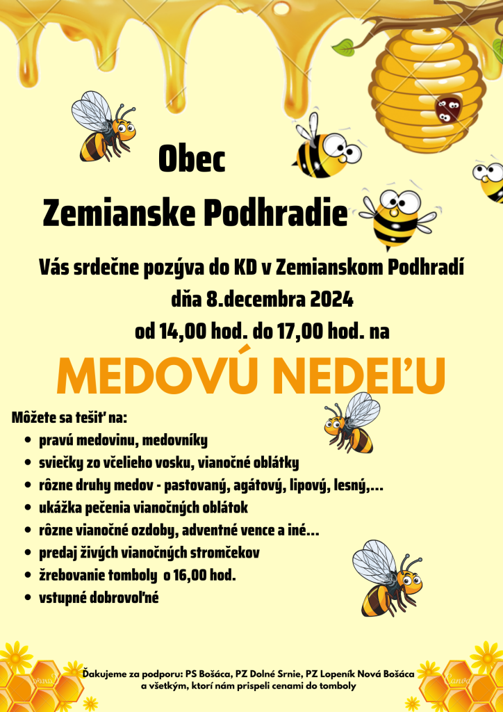Obec Zemianske Podhradie Vás srdečne pozýva do KD v Zemianskom Podhradí na MEDOVÚ NEDEĽU dňa 8.12.2024 od 14,00 do 17,00 hod.....