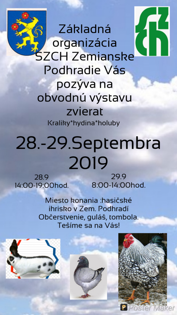 ZO SZCH Zemianske Podhradie vás pozývame na obvodnú výstavu zvierat, ktorá sa uskutoční v dňoch 28.- 29. septembra 2019 na hasičskom ihrisku v Zemianskom Podhradí.