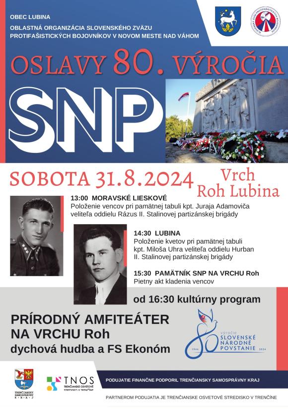 OBEC LUBINA A OBLASTNÁ ORGANIZÁCIA SLOVENSKÉHO ZVÄZU PROTIFAŚISTICKÝCH BOJOVNÍKOV V NOVOM MESTE NAD VÁHOM VÁS POZÝVAJÚ NA OSLAVY 80. VÝROĆIA SNP V SOBOTU 31.8.2024 VRCH ROH LUBINA O 13,00 HOD.