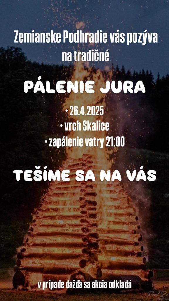 Podhradskí mládenci Vás pozývajú na tradičné pálenie "Jura " na vrchu Skalica v sobotu 26.apríla 2025. Zapálenie vatry o 21,00 hod. V prípade nepriaznivého počasia sa akcia odkladá.