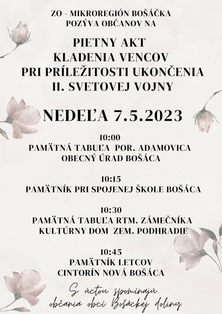 10,00 hod. Pamätná tabuľa por. Adamovica - Obecný úrad Bošáca