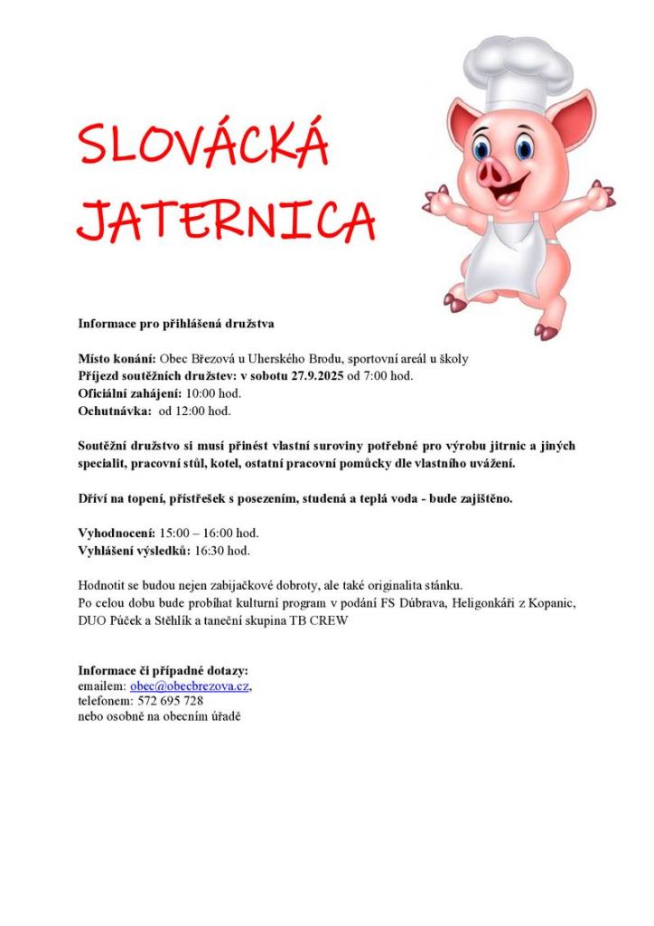 Pozvánka a pokyny pre súťažné družstvá na podujatie Slovácká JATERNICA a tradiční pokrmy Bílých Karpat, ktoré sa budú konať 27.9.2025 Obec Březová u Uherského Brodu, športový areál.