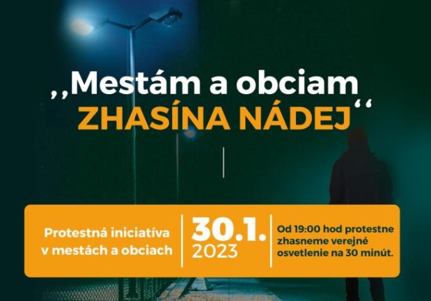 Celoslovenské protestné zhasnutie verejného osvetlenia sa uskutoční v pondelok 30. januára 2023 od 19,00 hod. Táto protestná iniciatíva bude trvať 30 minút .