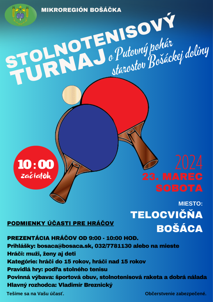 Mikroregion Bošáčka Vás pozýva na Stolnotenisový turnaj o Putovný pohár starostov Bošáckej doliny 23. marca 2024 o 10,00 hod. v telocvični v Bošáci.