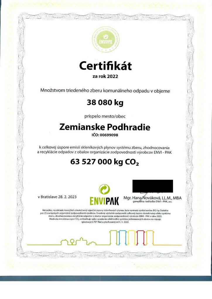 Aj obec Zemianske Podhradie, ako súčasť systému ENVI-PAK prevádzkujúceho triedený zber odpadu, má svoj podiel na celkovej úspore CO2, ktorú ENVI-PAK za rok 2022 dosiahol v množstve 63 527 000 kg.