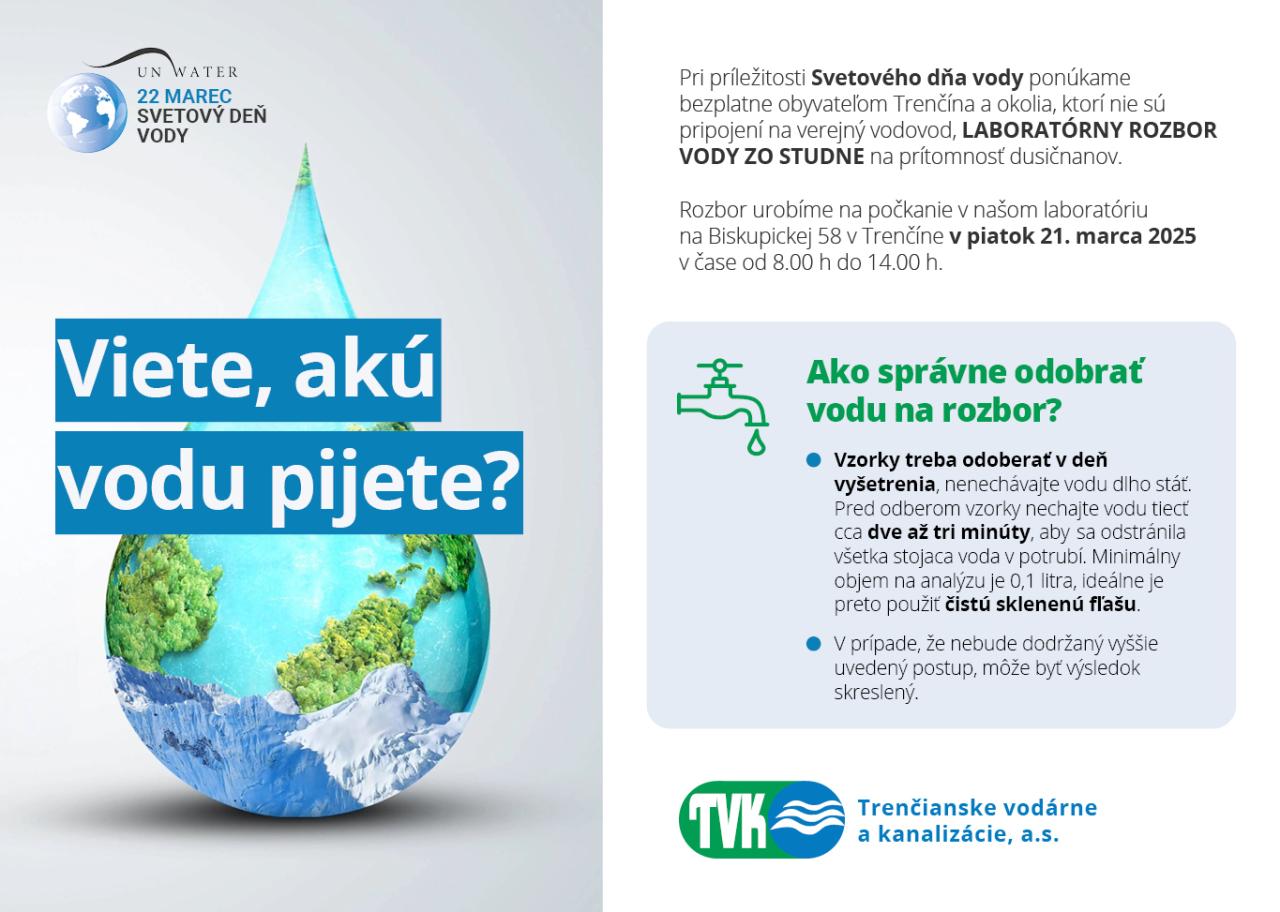 Pri príležitosti Svetového dňa vody, Trenčianske vodárne a kanalizácie ponúkajú občanom bezplatný laboratórny rozbor vody zo studní na prítomnosť dusičnanov. Rozbor sa uskutoční 21. marca 2025 od 8:00 do 14:00 na Biskupickej 58 v Trenčíne.