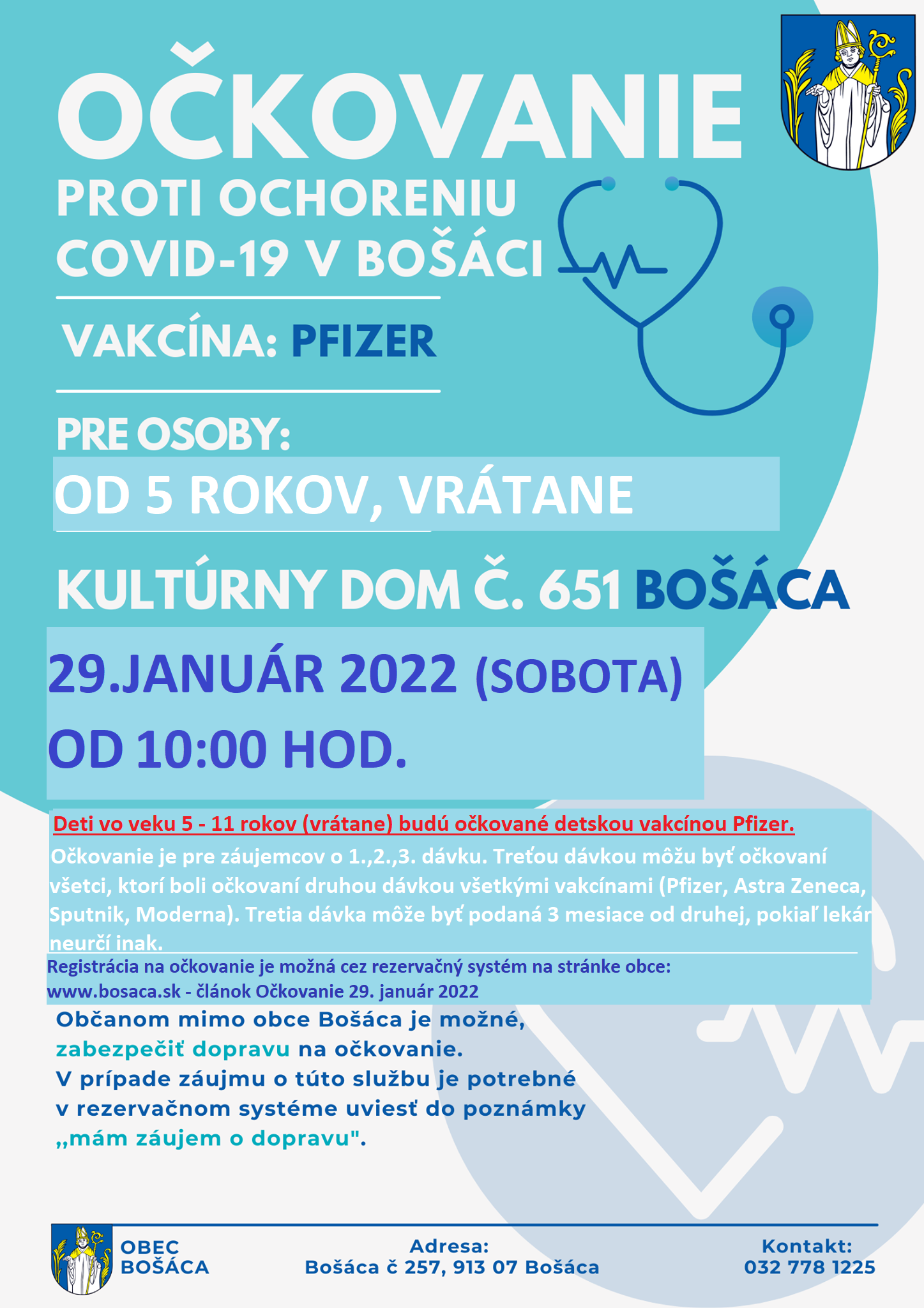 v KD Bošáca 29.01.2022 v sobotu od 10,00 hodiny. Tretia dávka môže byť podaná 3 mesiace od druhej, pokiaľ lekár neurčí inak. Treťou dávkou sa môžu očkovať všetci, ktorí boli zaočkovaní druhou dávkou vakcínami Astra Zeneca, Pfizer, Sputnik, Moderna.