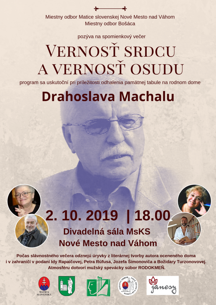 Dňa 02. 10., 2019 sa v Divadelnej sále MsKS v Novom Mesta nad Váhom uskutoční spomienkový večer pri príležitosti odhalenia pamätnej tabule na rodnom dome Drahoslava Machalu. Začiatok 18,00 hodine.